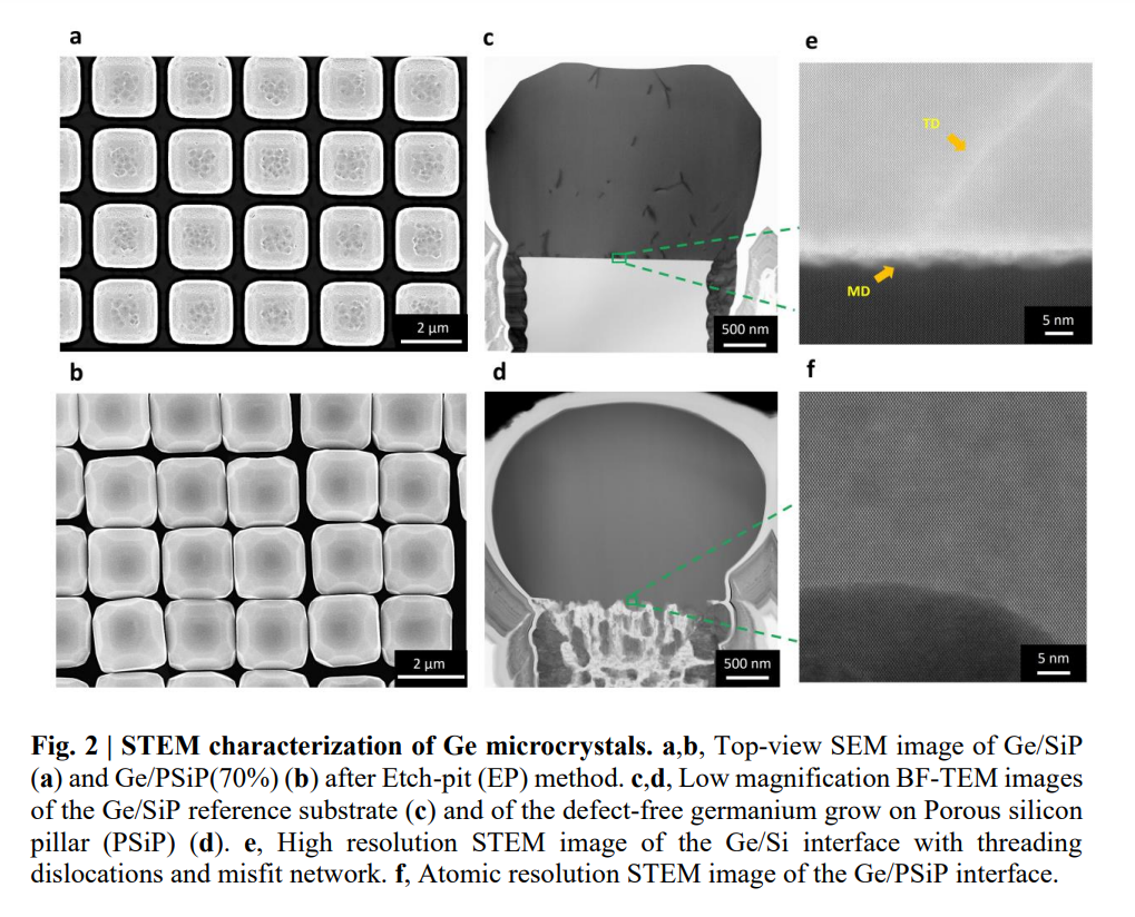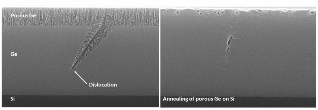 We use electrochemical etching of Ge/Si substrates to create voids along dislocations, followed by thermal annealing to promote their coalescence. These voids deflect or annihilate dislocations, lowering threading dislocation density to ~10⁴/cm². This method is a promising route for integrating III–V materials on silicon for high-efficiency solar cells.