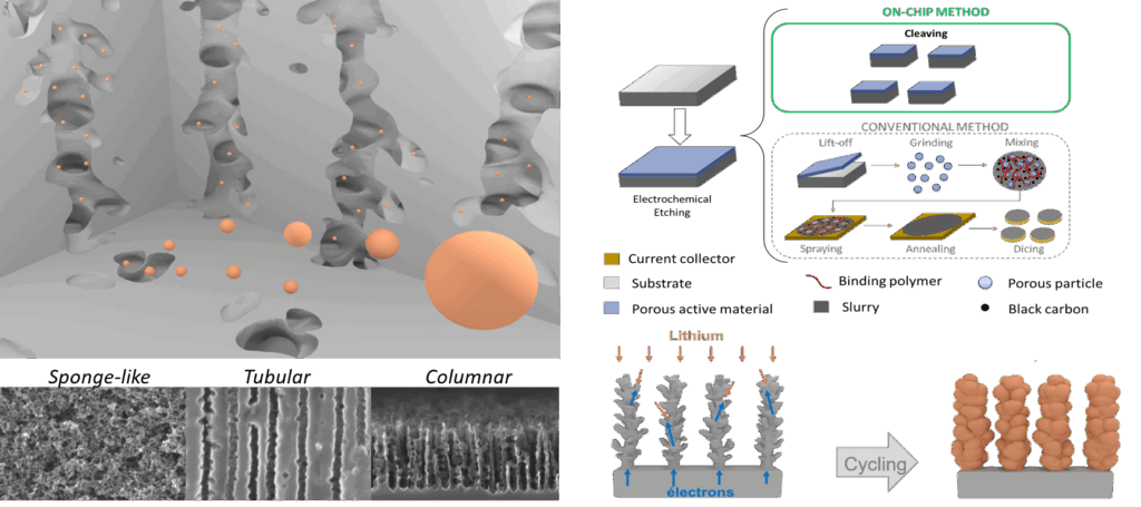 High-performance anode materials like silicon and germanium face challenges such as volumetric expansion and solid electrolyte interface (SEI) formation. Nanostructuring improves their lifetime and mechanical stability, while carbon functionalization reduces SEI and irreversible capacity. Building on this, we developed mesoporous germanium–graphene nanocomposites using scalable electrochemical etching and chemical vapor deposition, achieving superior electrochemical performance in both high-energy and high-power applications.